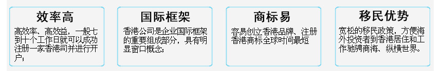 1、在香港注冊公司名稱選擇自由: 公司名稱允許含有地區性和行業性質,例如﹕中國、北京、浙江、香港、美國、法國、國際、亞洲、學院、出版社、協會、集團、控股、實業、發展、投資、財務、聯誼會、科技、醫療、基金、促進會等字眼。